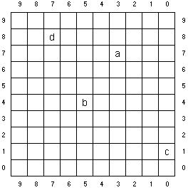 Each cache puzzle will consist of one or more 10x10 grids. Each row of a grid is numbered from 0 to 9, going from bottom to top, and each column is numbered from 0 to 9, going from right to left (see example grid below). Your goal will be to find four solution cells (labelled a,b,c,d in the example) in the grid(s). The Row,Column numbers for each solution cell will provide the values to substitute into formulas [aR].[bR][cR][dR] and [aC].[bC][cC][dC]. These values will then be added to the latitude (N-S) and longitude (W-E) of the coordinate location provided to come up with the actual location.